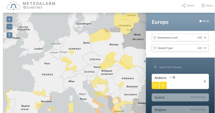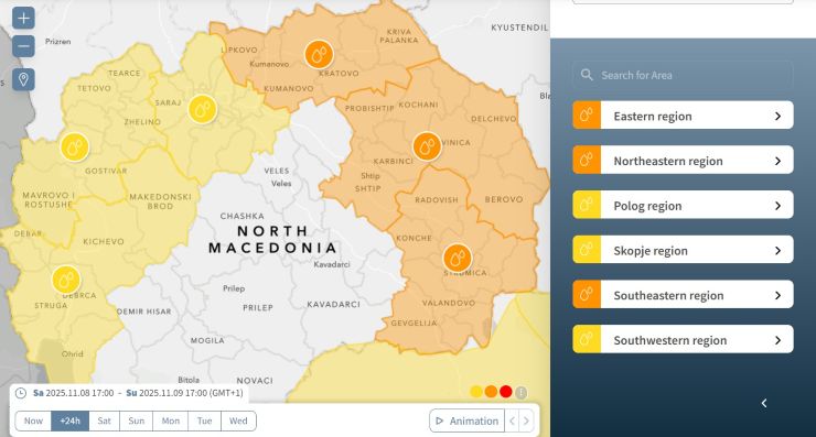 И според Euro Weather, Македонија е во групата европски земји кадешто има различен степен на временски аларм, заедно со Андора, Словачка, БиХ, Србија, Грција, Кипар, Шпанија околу Барселона, крајбрежето на Португалија, во Латвија ( Летонија ) и Словачка.