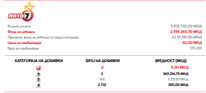 Добивка со седум погодоци немаше, а имаше две шестки вредни  260.214,75 денари.