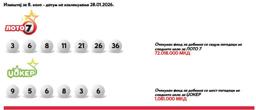 Во 6 коло на Лото7 извлечени беа следните броеви: 3,6,8,11,21,26,36