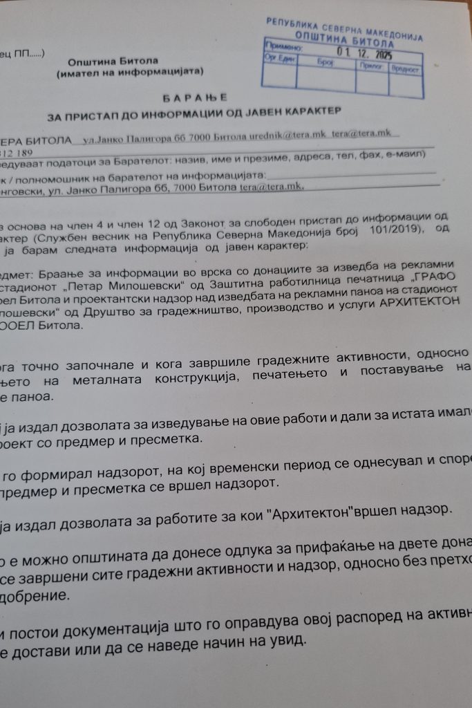 Тера ТВ првпат побара податоци од Општина Битола уште на 26 септември 2025. Kој ја поставил металната конструкција и платното на јужната страна, колку чини тоа, дали имало тендер и кој е изведувачот ?  Одговор добивме дури на 30 октомври, со објаснување дека станува збор за „брендирање“. Веднаш поднесовме ново барање да ни бидат доставени конкретни бројки, договори, изведувач и датум на изведба. До денес, нема одговор.