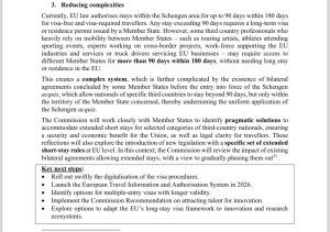 Во него се посочува: „Во моментов, законодавството на ЕУ дозволува престој во Шенген-зоната до 90 дена во период од 180 дена за патници кои не бараат виза и за оние на кои им е потребна виза. Секој престој подолг од 90 дена бара долгорочна виза или дозвола за престој издадена од земја-членка. Сепак, некои професионалци од трети земји кои во голема мера зависат од мобилност меѓу земјите-членки – како уметници на турнеи, спортисти кои учествуваат на спортски настани, експерти што работат на прекугранични проекти, работна сила што ги поддржува индустриите и услугите во ЕУ или возачи на камиони што опслужуваат бизниси во ЕУ – можеби ќе имаат потреба од пристап до различни земји-членки повеќе од 90 дена во период од 180 дена, без да им е потребна долгорочна виза или престој во ЕУ. Ова создава комплексен систем, кој дополнително се усложнува поради постоењето на билатерални договори склучени од некои земји-членки пред стапувањето во сила на Шенгенскиот правен систем (acquis). Овие договори им дозволуваат на државјани од одредени трети земји да престојуваат подолго од 90 дена, но само на територијата на конкретната земја-членка, со што се поткопува унифицираната примена на Шенгенскиот правен систем“.