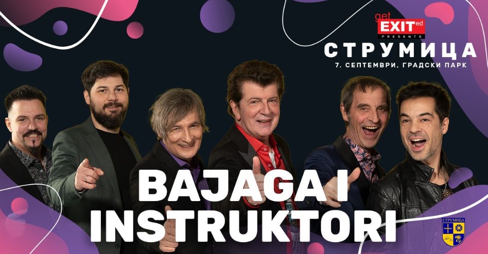 Една од најголемите поп-рок групи на овие простори, Бајага и Инструктори, откако минатата година одбележа величествени 40 години кариера, со неспоредлива енергија и жар продолжува со својата турнеја која ја носи на Get EXITed журката на 7 септември. Големиот градски парк во Струмица ќе ги собере љубителите на квалитетниот гитарски звук, кои едногласно ќе ги пеат едни од најголемите рокенрол химни што овој култен музички состав ги создаде во текот на своето четиридецениско постоење.