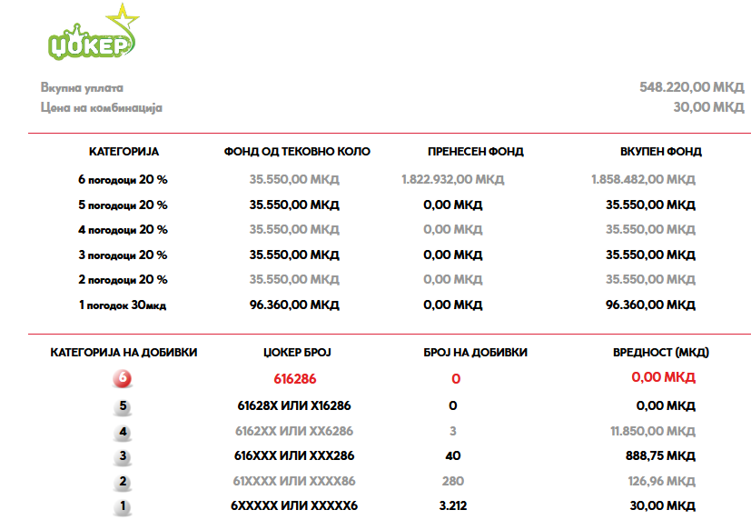 Очекуваниот фонд за добивка со шест погодоци на играта џокер во следното коло изнесува 1.894.000 денари.