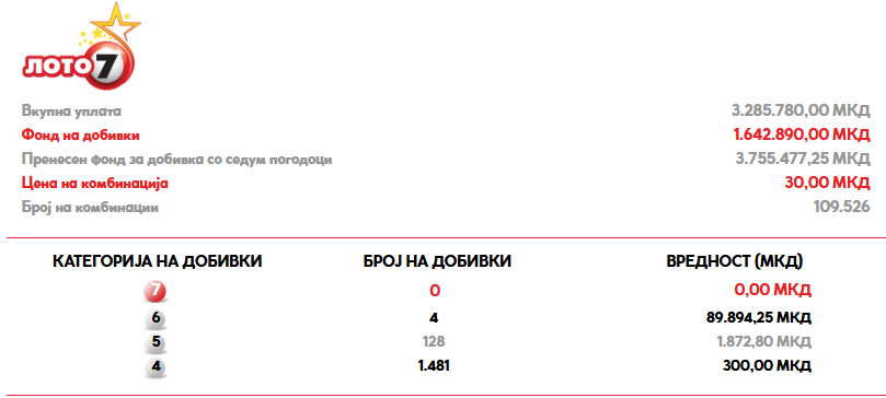 Добивка со седум погодоци немаше а имаше четири добивки со шест погодоци вредни 89.894,25 денари.