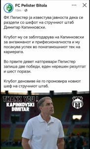 Фудбалскиот клуб Пелистер се раздели со шефот на стручниот клуб Димитар Капинковски, соопшти предмалку ФК Пелистер. Клубот му се заблагодари на Капинковски како што стои во соопштението за ангажманот и професионалноста посакувајќи му успех во натамошната кариера. Во првите девет натпревари Пелистер запиша две победи, еден нерешен резултат и шест порази, информираше клубот најавувајќи дека деновиве ќе го промовира новиот шеф на стручниот штаб.