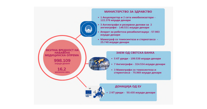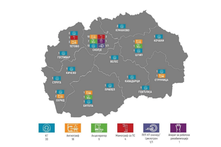 Анализата на снабденоста со современа медицинска опрема по градови покажува дека во изминатите три години е постигнат напредок во обезбедувањето на регионална распределеност на новата опрема во јавното здравство, како и во зголемувањето на вкупниот број здравствени услуги.