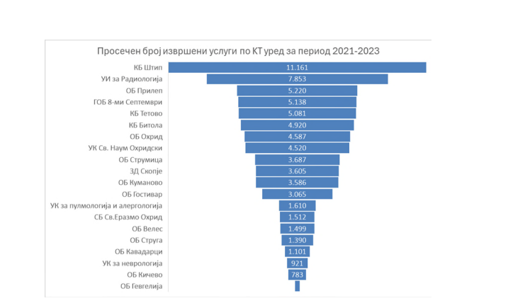 Со извршената анализа на добиените податоци од ЈЗУ, регистарот на медицинска опрема и Мој Термин, утврдено е дека побарувачката за КТ услуги е во постојан пораст. За дел од ЈЗУ, КТ уредите се користат со полн капацитет, но половина од нив се целосно амортизирани, што води до зголемени трошоци за одржување и чести дефекти, како што е случајот со КТ уредот во болницата во Струмица кој не функционираше речиси цела 2024 година.