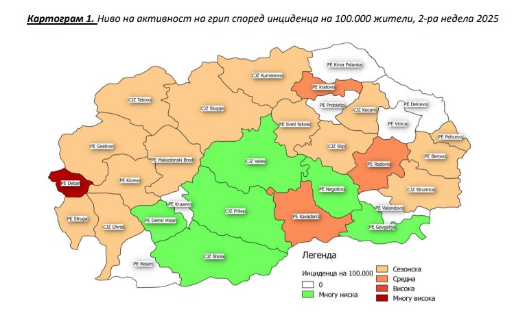 Институтот за јавно здравје во својата информација за јавност за втората недела од 2025 година вели дека „регистрирани се 1.053 случаи на заболени од грип или инфекции со симптоми слични на грипот. Најголем дел од нив се деца. -633 се на возраст од 15 до 64 години, 179 се деца на возраст од пет до 14 години, а 144 се до четиригодишна возраст.“