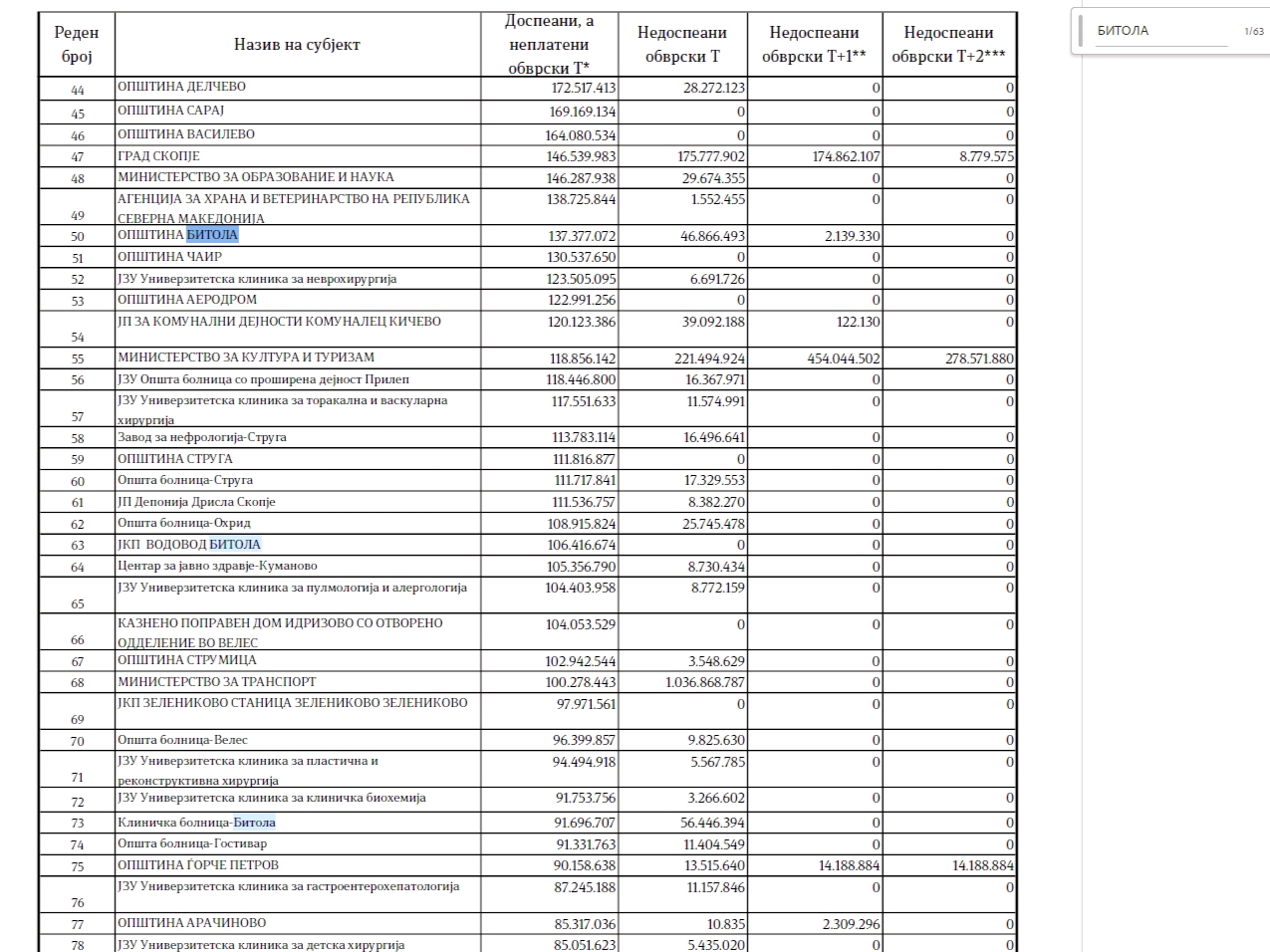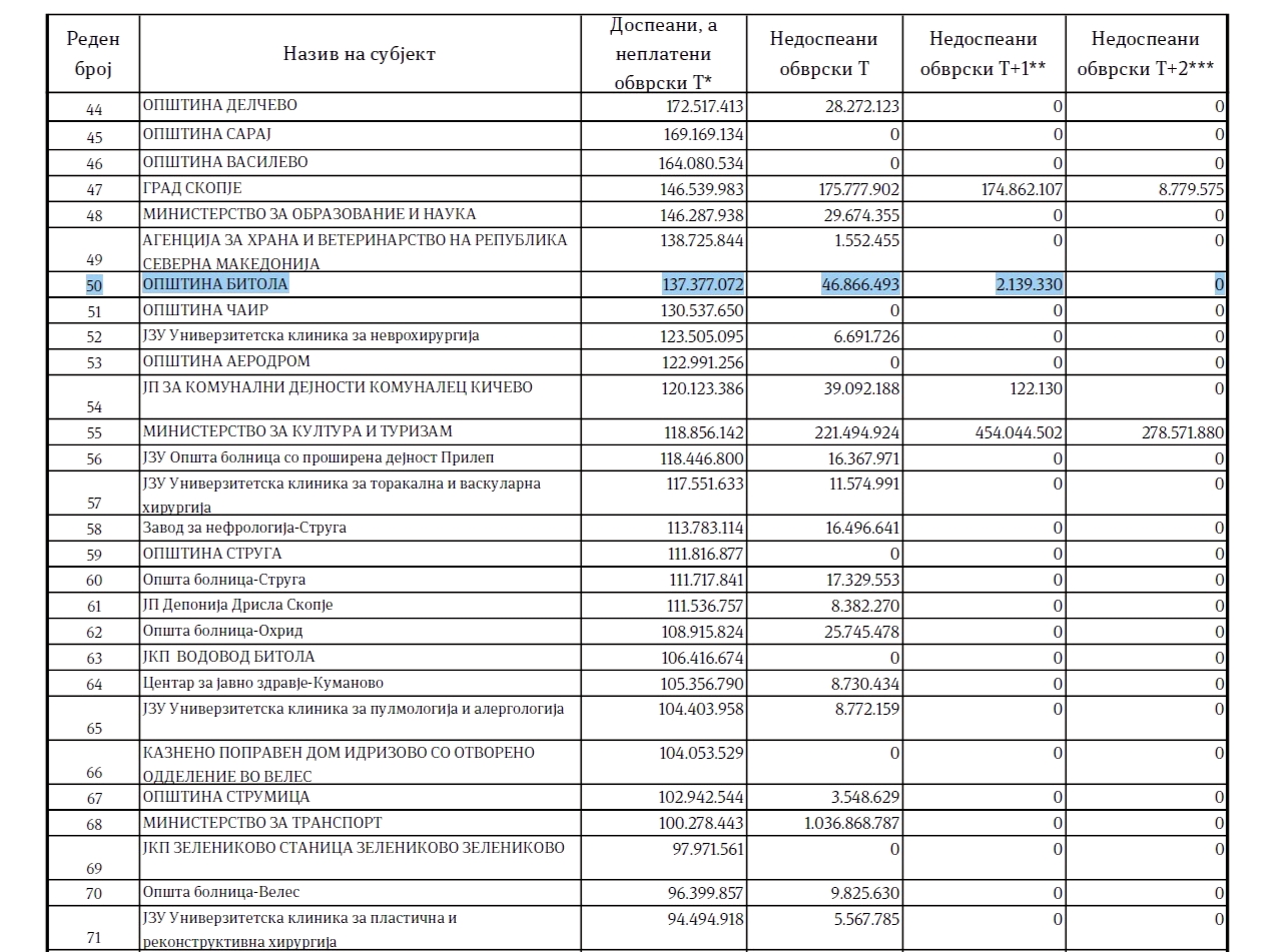 Општина Битола “изби” на првото место на листата должници од јавниот сектор во градот со вкупни обврски од околу 186,4 милиони денари. Од нив 137,4 милиони денари се доспеани и неплатени, а 48,9 милиони недоспеани обврски. До 2025 година, оваа неславна позиција ја држеше ЈКП Водовод.
