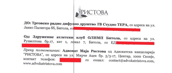 Ние како сериозен медиум, односно телевизиска куќа со регионална концесија, поведени пред се од начелата на транспарентност, објективност и проверка на сите страни на темите од сториите кои ги обработуваме сега и во иднина, без никаков проблем ќе го објавиме изворно и во целост пристигнатото барање од страна на Здружение атлетски клуб ОЛИМП Битола преку полномошник: Адвокат Маја Ристова од Адвокатска канцеларија “РИСТОВА”,Скопје , за да Вие како јавност можете да оцените дали во истото се алудира на евентуални суптилни закани за да повеќе оваа тема не се обработува од Наша страна или пак се дадени одговори со факти и докази, како се трошат Нашите пари од Буџетот на градот Битола.