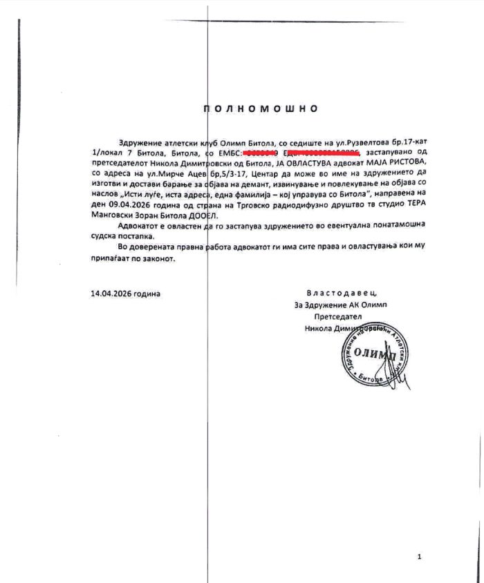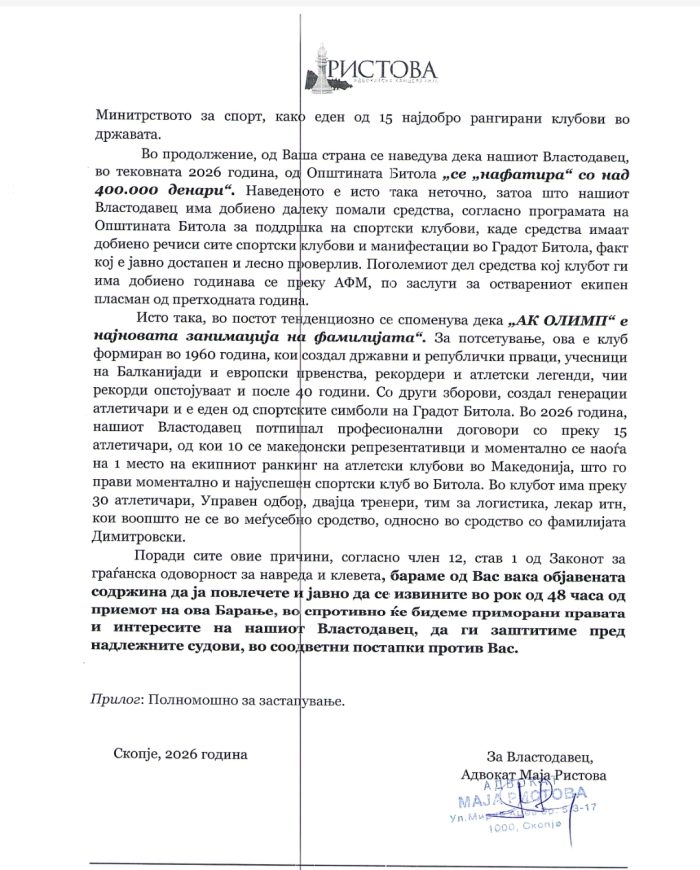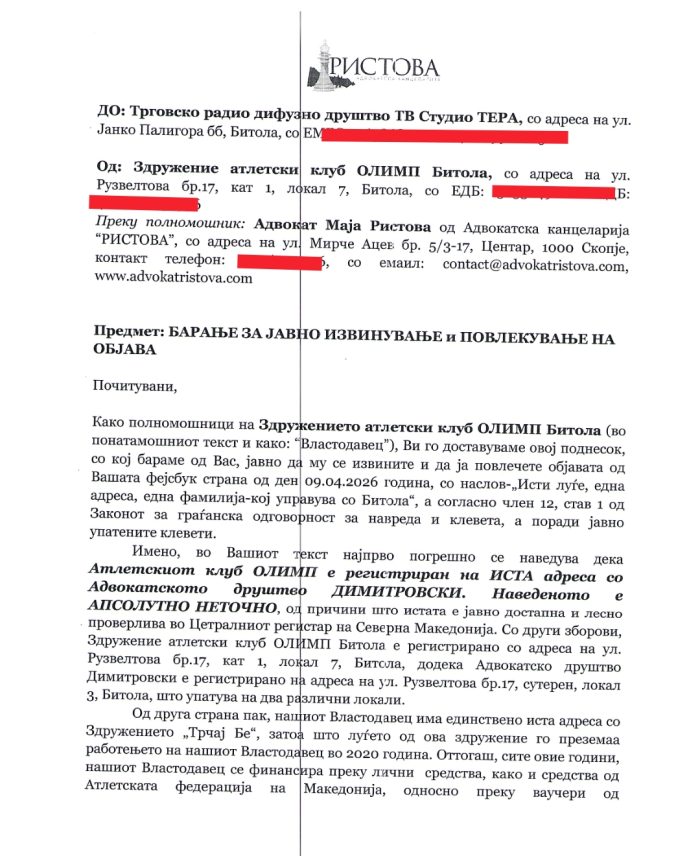 Во текот на вчерашниот ден во попладневните часови, до Нашата редакција пристигна е-маил од страна на Здружение атлетски клуб ОЛИМП Битола преку полномошник: Адвокат Маја Ристова од Адвокатска канцеларија “РИСТОВА”,Скопје, со прилог Барање за објавување на демант, исправка и јавно извинување во врска со наша објава „Исти луѓе, иста адреса, една фамилија – кој управува со Битола “ која објава претставува само дел од Нашата истражувачка сторија, која во рамките на новинарската професија, ја обработува како тема Нашиот новинарски тим.Со оглед на фактот дека Здружение атлетски клуб ОЛИМП Битола кое што користи јавни пари добиени на општинските јавни повици а тоа се парите на граѓаните, па истите – граѓаните несомнено е дека имаат право да бидат информирани за тоа како се трошат нивните пари во контиунуитет.