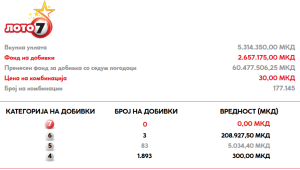 Добивка со седум погодоци немаше, а имаше три шестки вредни 208.927,50 денари.