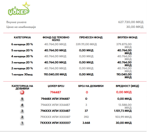 Во ова коло шестоцифрениот џокер број е: 7,9,4,4,8,7